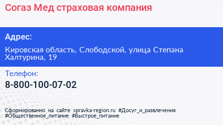 Согаз-Мед, страховая компания по адресу Кировская область, Слободской, улица Степана Халтурина, 19 в дальнейшем Организация, размещена в следующих категориях: