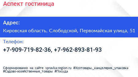 Аспект, гостиница по адресу Кировская область, Слободской, Первомайская улица, 51 в дальнейшем Организация, размещена в следующих категориях: