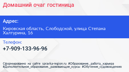 Домашний очаг, гостиница по адресу Кировская область, Слободской, улица Степана Халтурина, 16 в дальнейшем Организация, размещена в следующих категориях: