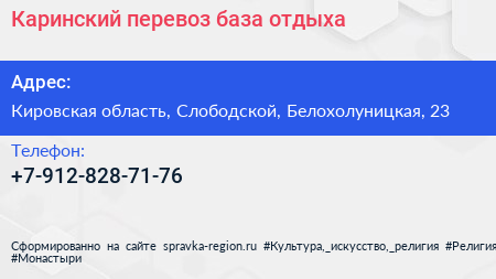 Каринский перевоз, база отдыха по адресу Кировская область, Слободской, Белохолуницкая, 23 в дальнейшем Организация, размещена в следующих категориях: