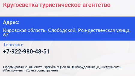 Кругосветка, туристическое агентство по адресу Кировская область, Слободской, Рождественская улица, 67 в дальнейшем Организация, размещена в следующих категориях: