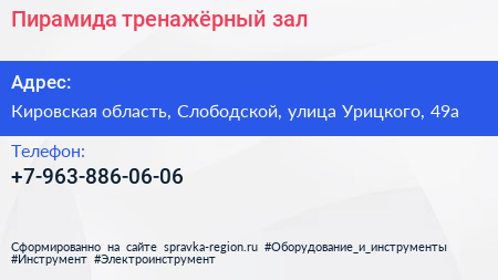 Пирамида, тренажёрный зал по адресу Кировская область, Слободской, улица Урицкого, 49а в дальнейшем Организация, размещена в следующих категориях: