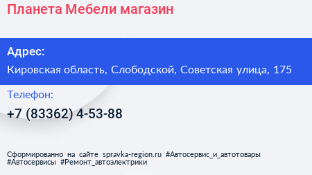 Планета Мебели, магазин по адресу Кировская область, Слободской, Советская улица, 175 в дальнейшем Организация, размещена в следующих категориях: