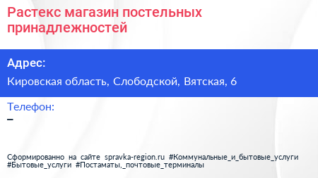 Растекс, магазин постельных принадлежностей по адресу Кировская область, Слободской, Вятская, 6 в дальнейшем Организация, размещена в следующих категориях: