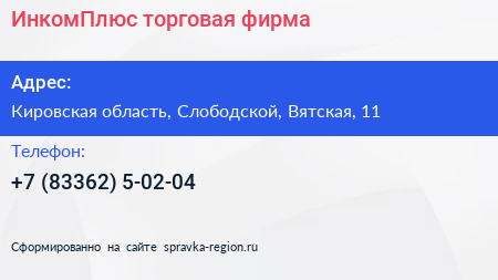 ИнкомПлюс, торговая фирма по адресу Кировская область, Слободской, Вятская, 11 в дальнейшем Организация, размещена в следующих категориях: