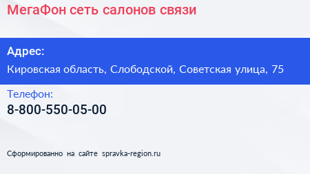МегаФон, сеть салонов связи по адресу Кировская область, Слободской, Советская улица, 75 в дальнейшем Организация, размещена в следующих категориях: