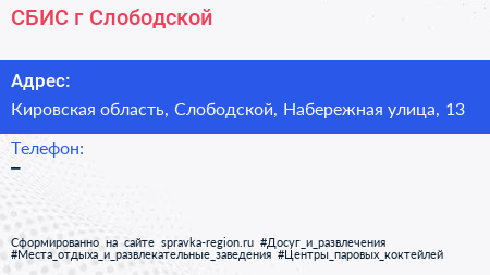 СБИС г. Слободской по адресу Кировская область, Слободской, Набережная улица, 13 в дальнейшем Организация, размещена в следующих категориях: