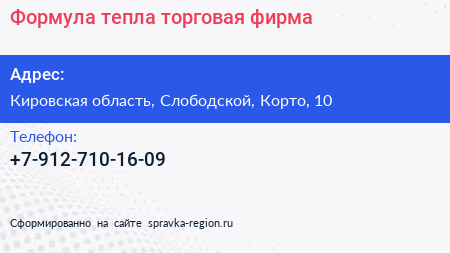Формула тепла, торговая фирма по адресу Кировская область, Слободской, Корто, 10 в дальнейшем Организация, размещена в следующих категориях: