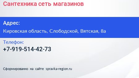 Сантехника, сеть магазинов по адресу Кировская область, Слободской, Вятская, 8а в дальнейшем Организация, размещена в следующих категориях: