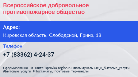 Всероссийское добровольное противопожарное общество по адресу Кировская область, Слободской, Грина, 18 в дальнейшем Организация, размещена в следующих категориях: