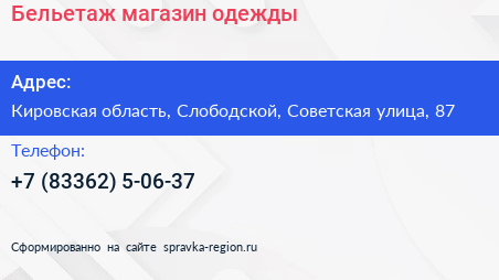 Бельетаж, магазин одежды по адресу Кировская область, Слободской, Советская улица, 87 в дальнейшем Организация, размещена в следующих категориях: