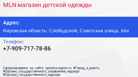 MLN, магазин детской одежды по адресу Кировская область, Слободской, Советская улица, 66а в дальнейшем Организация, размещена в следующих категориях: