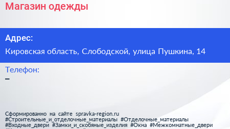 Магазин одежды по адресу Кировская область, Слободской, улица Пушкина, 14 в дальнейшем Организация, размещена в следующих категориях: