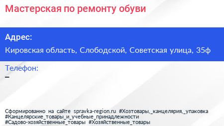 Мастерская по ремонту обуви по адресу Кировская область, Слободской, Советская улица, 35ф в дальнейшем Организация, размещена в следующих категориях:
