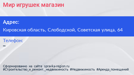 Мир игрушек, магазин по адресу Кировская область, Слободской, Советская улица, 64 в дальнейшем Организация, размещена в следующих категориях: