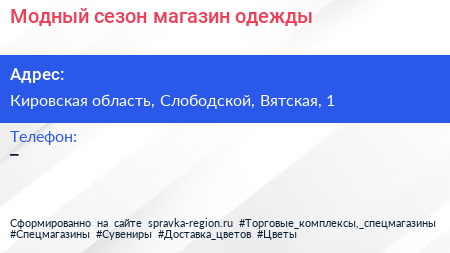 Модный сезон, магазин одежды по адресу Кировская область, Слободской, Вятская, 1 в дальнейшем Организация, размещена в следующих категориях: