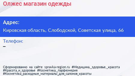 Олжес, магазин одежды по адресу Кировская область, Слободской, Советская улица, 66 в дальнейшем Организация, размещена в следующих категориях: