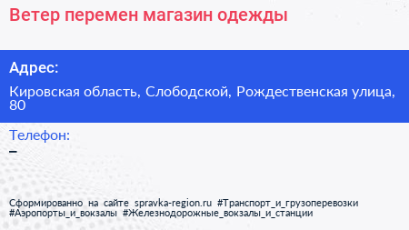 Ветер перемен, магазин одежды по адресу Кировская область, Слободской, Рождественская улица, 80 в дальнейшем Организация, размещена в следующих категориях:
