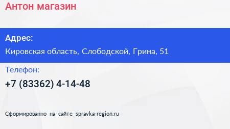 Антон, магазин по адресу Кировская область, Слободской, Грина, 51 в дальнейшем Организация, размещена в следующих категориях: