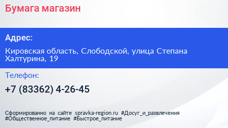 Бумага, магазин по адресу Кировская область, Слободской, улица Степана Халтурина, 19 в дальнейшем Организация, размещена в следующих категориях: