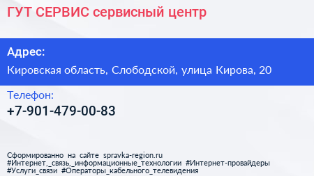 ГУТ СЕРВИС, сервисный центр по адресу Кировская область, Слободской, улица Кирова, 20 в дальнейшем Организация, размещена в следующих категориях: