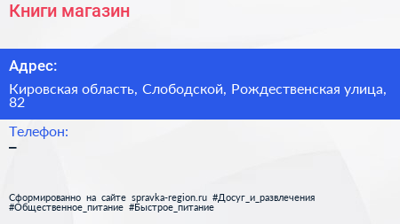 Книги, магазин по адресу Кировская область, Слободской, Рождественская улица, 82 в дальнейшем Организация, размещена в следующих категориях: