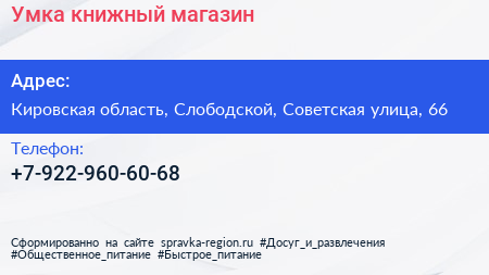Умка, книжный магазин по адресу Кировская область, Слободской, Советская улица, 66 в дальнейшем Организация, размещена в следующих категориях: