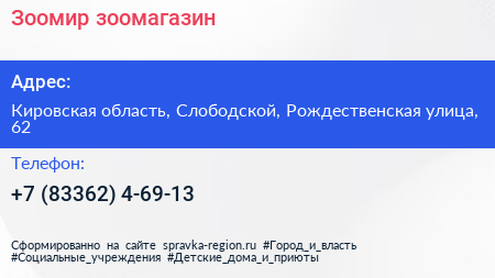 Зоомир, зоомагазин по адресу Кировская область, Слободской, Рождественская улица, 62 в дальнейшем Организация, размещена в следующих категориях: