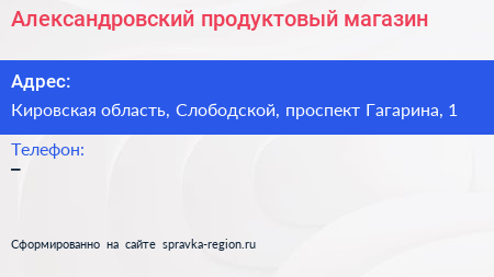 Александровский, продуктовый магазин по адресу Кировская область, Слободской, проспект Гагарина, 1 в дальнейшем Организация, размещена в следующих категориях: