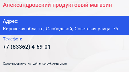 Александровский, продуктовый магазин по адресу Кировская область, Слободской, Советская улица, 75 в дальнейшем Организация, размещена в следующих категориях:
