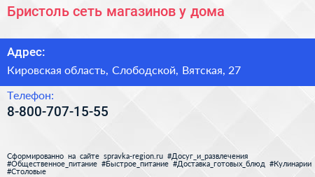 Бристоль, сеть магазинов у дома по адресу Кировская область, Слободской, Вятская, 27 в дальнейшем Организация, размещена в следующих категориях: