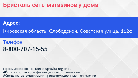 Бристоль, сеть магазинов у дома по адресу Кировская область, Слободской, Советская улица, 112ф в дальнейшем Организация, размещена в следующих категориях: