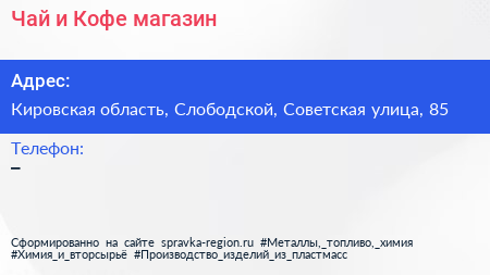 Чай и Кофе, магазин по адресу Кировская область, Слободской, Советская улица, 85 в дальнейшем Организация, размещена в следующих категориях: