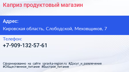 Каприз, продуктовый магазин по адресу Кировская область, Слободской, Меховщиков, 7 в дальнейшем Организация, размещена в следующих категориях: