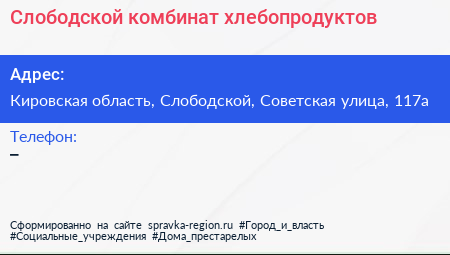 Слободской комбинат хлебопродуктов по адресу Кировская область, Слободской, Советская улица, 117а в дальнейшем Организация, размещена в следующих категориях: