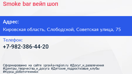 Smoke bar, вейп-шоп по адресу Кировская область, Слободской, Советская улица, 75 в дальнейшем Организация, размещена в следующих категориях: