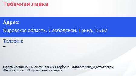 Табачная лавка по адресу Кировская область, Слободской, Грина, 15/87 в дальнейшем Организация, размещена в следующих категориях: