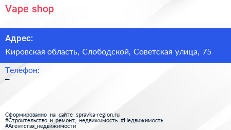 Vape shop по адресу Кировская область, Слободской, Советская улица, 75 в дальнейшем Организация, размещена в следующих категориях: