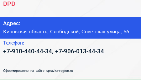 DPD по адресу Кировская область, Слободской, Советская улица, 66 в дальнейшем Организация, размещена в следующих категориях: