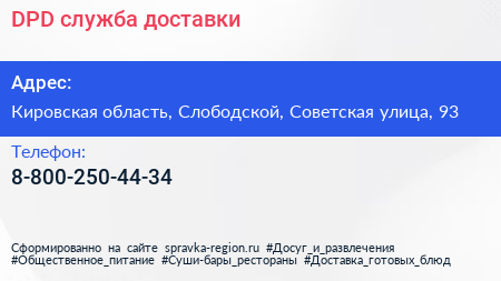 DPD, служба доставки по адресу Кировская область, Слободской, Советская улица, 93 в дальнейшем Организация, размещена в следующих категориях: