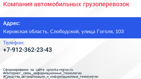Компания автомобильных грузоперевозок по адресу Кировская область, Слободской, улица Гоголя, 103 в дальнейшем Организация, размещена в следующих категориях: