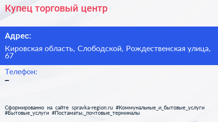 Купец, торговый центр по адресу Кировская область, Слободской, Рождественская улица, 67 в дальнейшем Организация, размещена в следующих категориях: