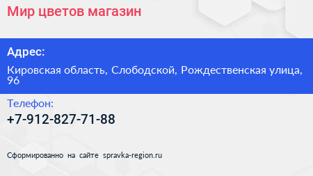 Мир цветов, магазин по адресу Кировская область, Слободской, Рождественская улица, 96 в дальнейшем Организация, размещена в следующих категориях: