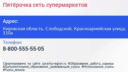 Пятёрочка, сеть супермаркетов по адресу Кировская область, Слободской, Красноармейская улица, 110а в дальнейшем Организация, размещена в следующих категориях: