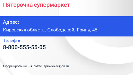 Пятерочка, супермаркет по адресу Кировская область, Слободской, Грина, 45 в дальнейшем Организация, размещена в следующих категориях: