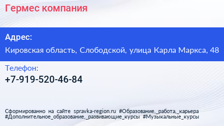Гермес, компания по адресу Кировская область, Слободской, улица Карла Маркса, 48 в дальнейшем Организация, размещена в следующих категориях: