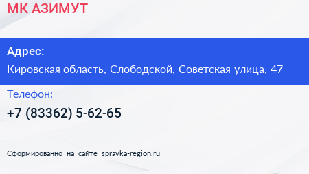 МК АЗИМУТ по адресу Кировская область, Слободской, Советская улица, 47 в дальнейшем Организация, размещена в следующих категориях: