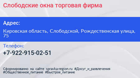 Слободские окна, торговая фирма по адресу Кировская область, Слободской, Рождественская улица, 75 в дальнейшем Организация, размещена в следующих категориях: