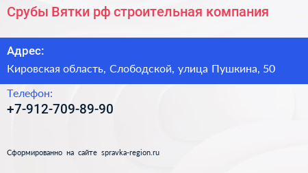 Срубы-Вятки.рф, строительная компания по адресу Кировская область, Слободской, улица Пушкина, 50 в дальнейшем Организация, размещена в следующих категориях: