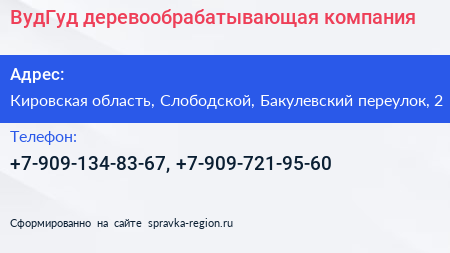 ВудГуд, деревообрабатывающая компания по адресу Кировская область, Слободской, Бакулевский переулок, 2 в дальнейшем Организация, размещена в следующих категориях: